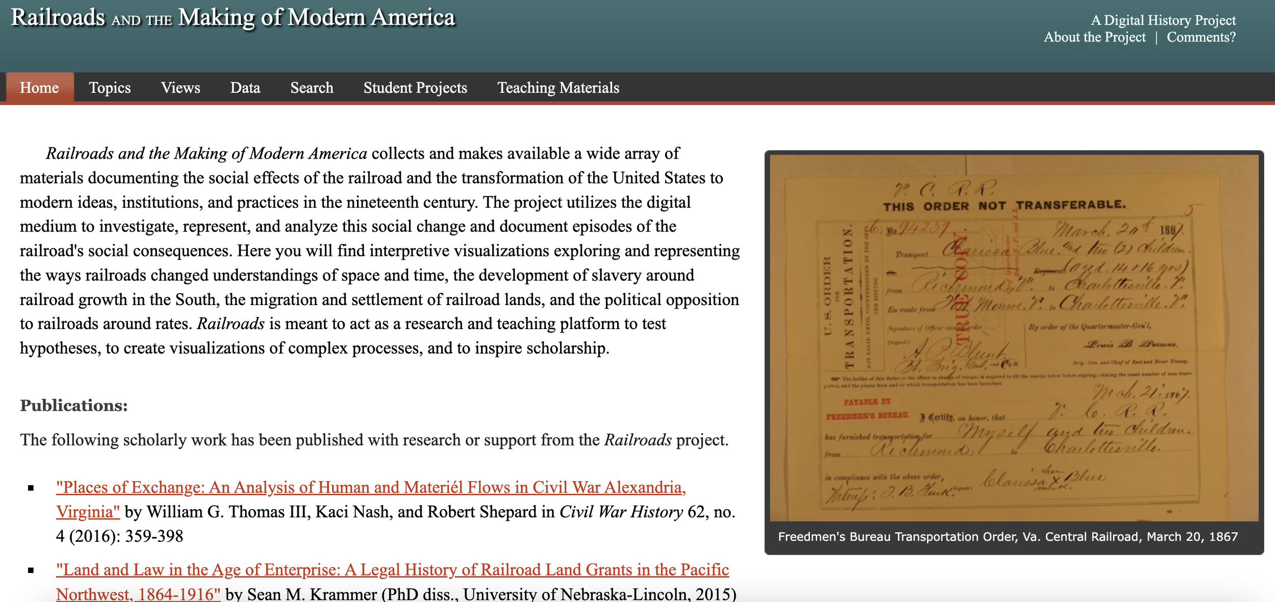 To begin with, "Railroads and the Making of Modern America" is a digital exhibit project. This project provides a detailed exploration of the huge impact that the railroads had on the United States during the 19th Century. This website has utilized wide range of materials such as scholarly publications, interpretive visualizations, and student projects. The main objective of this website is provide users with documentations and analysis of the social, economic, and cultural transformations that came forth as a result of the railroad industry. Needless to say, this project covers a period that is utterly significant to the history of America. The website has focused on a number of themes including the development of slavery in the South, the migration and settlement of railroad lands, and the political as well as the economic consequences of expansion of the railroad. Going through the website, it sheds light on the interconnectedness of railroads and the modernization of America.